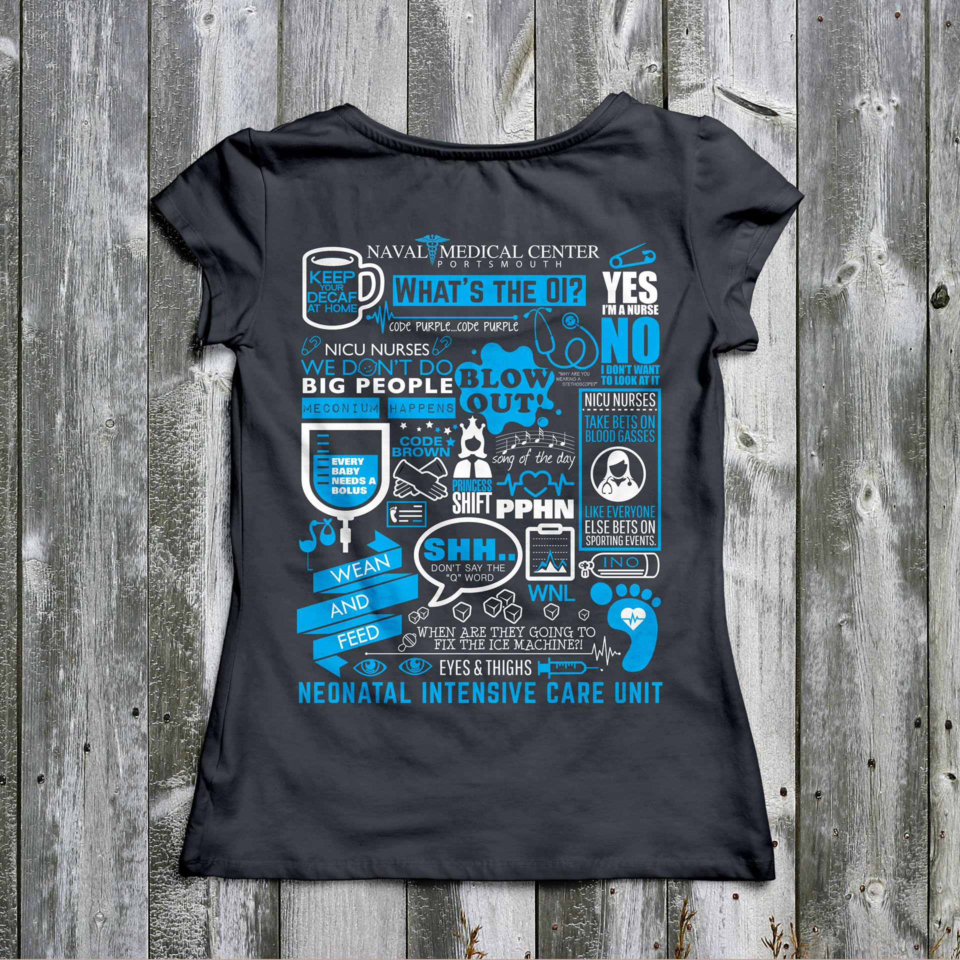 A t-shirt design that I put together for the Naval Medical Center- Portsmouth's Neonatal Care Unit. They sold the shirt to other nurses to raise funds for their annual NICU reunion.